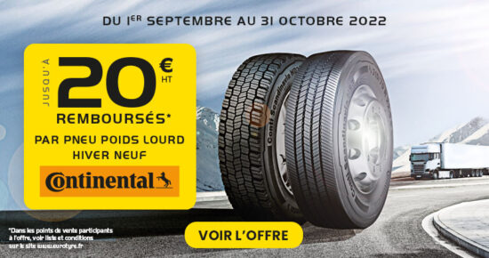 Du 1er septembre au 31 octobre 2021, pour l’achat d’un pneumatiques Poids Lourd hiver neufs Continental, bénéficiez de remboursement jusqu’à […]